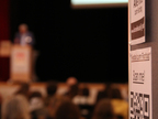 Blick in einen Vortragssaal mit Infopun...
