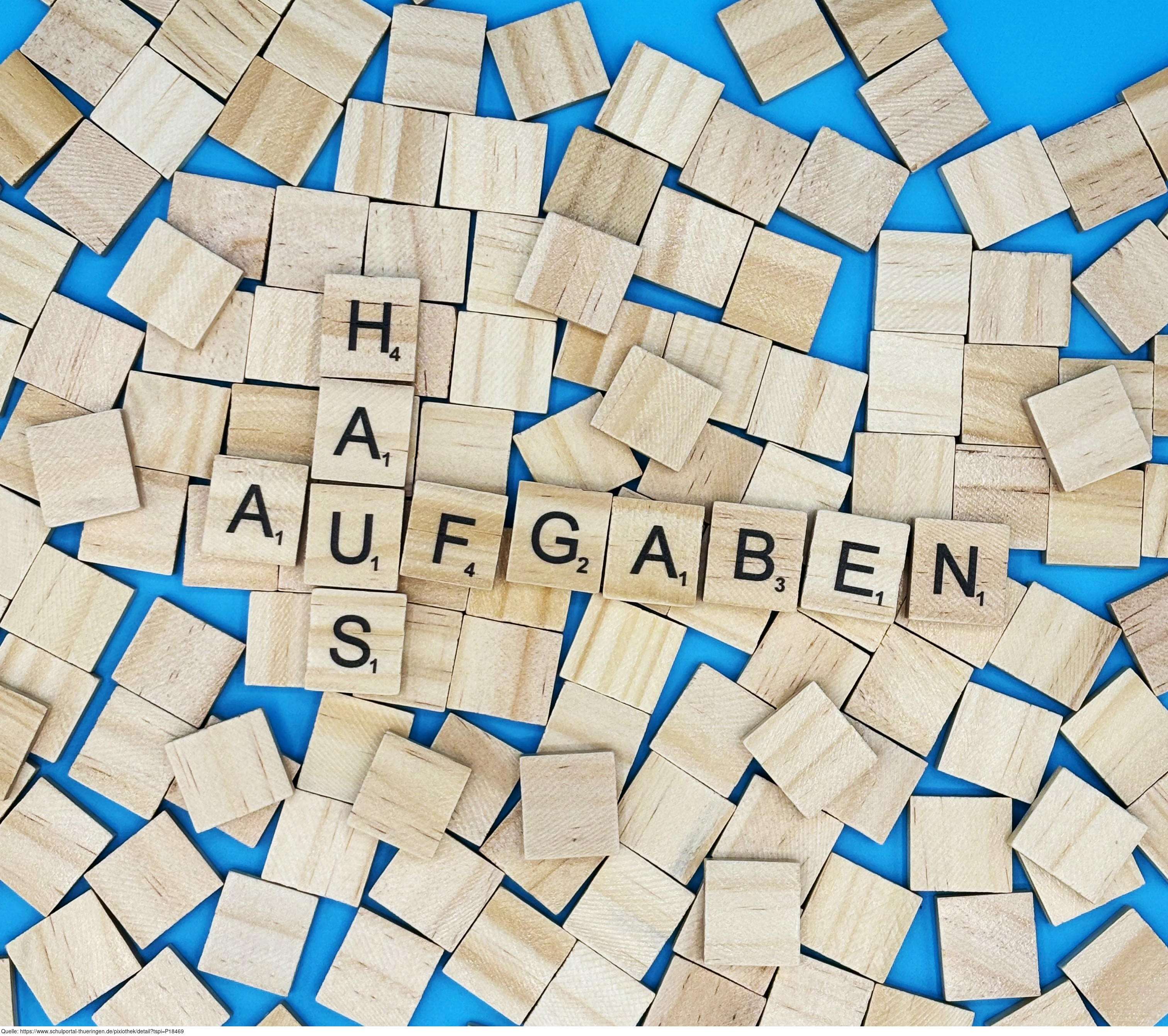Aus Buchstaben wurde das Wort "Hausaufgaben" gelegt. Es gelten die Nutzungsbedingungen der Mediothek und Pixiothek.