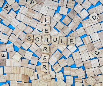 Aus Buchstaben wurden die Wörter "Schule" und "Lehrer" gelegt. Es gelten die Nutzungsbedingungen der Mediothek und Pixiothek.