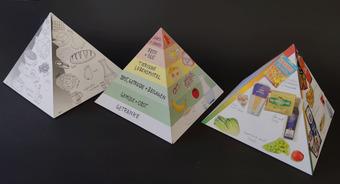 Das Bild zeigt drei Pyramiden aus Papier. Es gehört zur Serie "Ernährungspyramide zum Basteln und Gestalten" und findet u.a. im gleichnamigen Lernobjekt unter https://www.schulportal-thueringen.de/web/guest/media/detail?tspi=18517 Verwendung. Es gelten die Nutzungsbedingungen der Mediothek und Pixiothek.