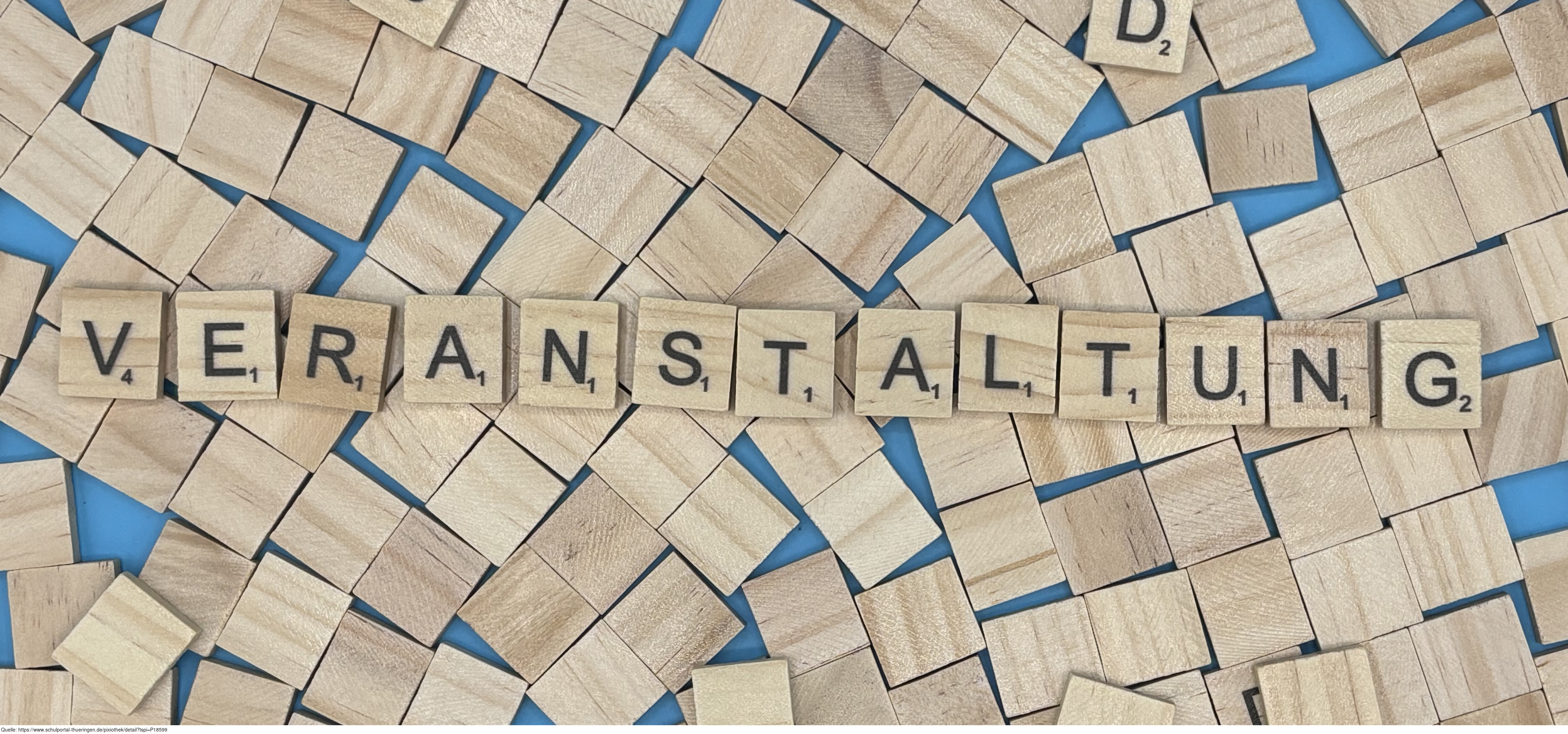 Aus Buchstaben wurde das Wort "Veranstaltung" gelegt. Es gelten die Nutzungsbedingungen der Mediothek und Pixiothek.