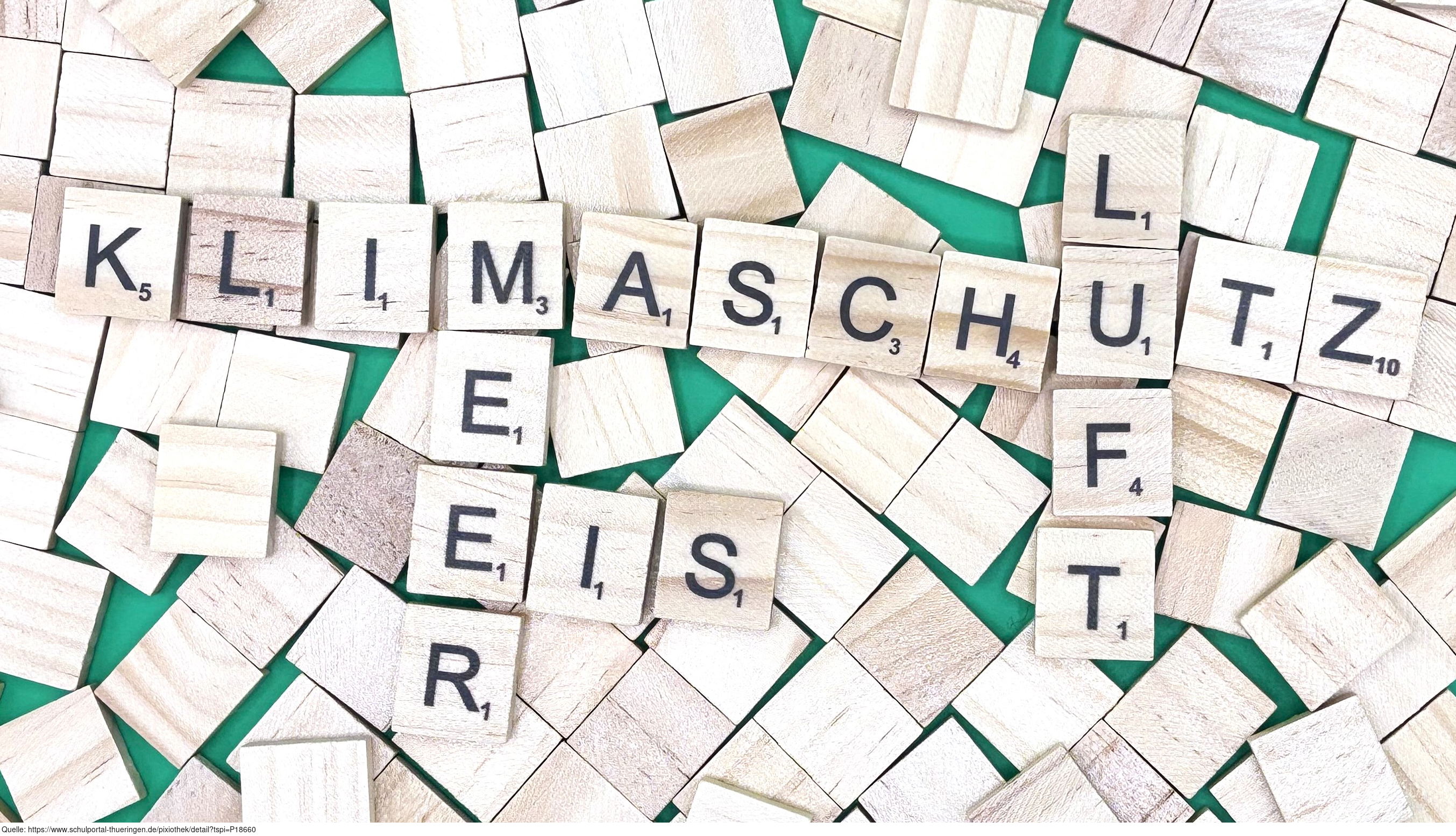 Aus Buchstaben wurden die Begriffe "Klimaschutz", "Meer", "Eis" und "Luft" gelegt. Es gelten die Nutzungsbedingungen der Mediothek und Pixiothek.