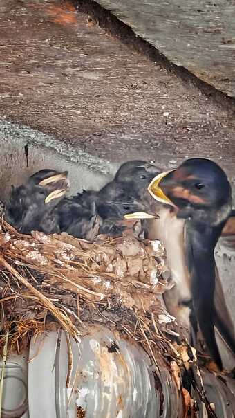 Junge Rauchschwalben bei der Fütterung