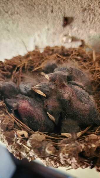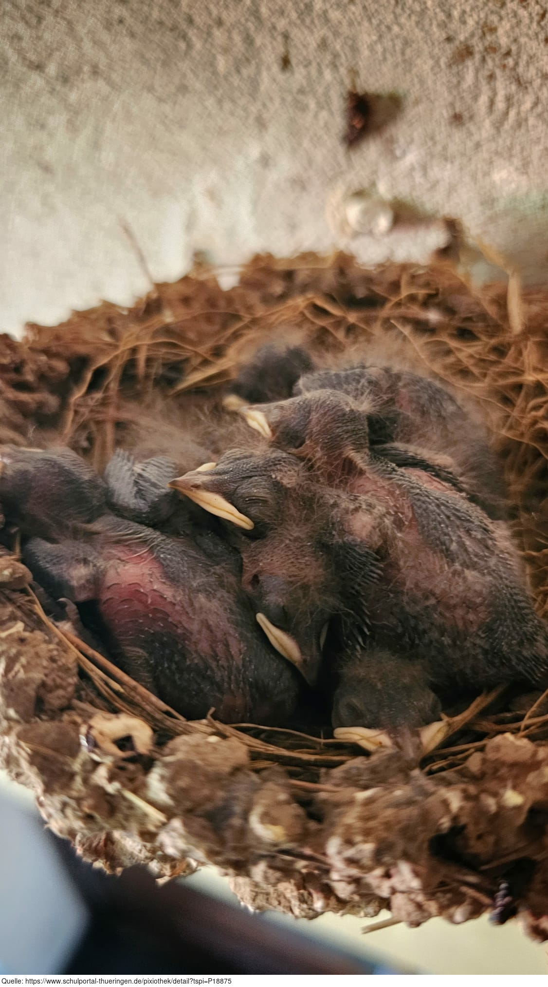 Das Foto gehört zur Serie "Schwalbenfreundliches Haus". Es zeigt junge Rauchschwalben im Nest. Das Nest befindet sich in einer Scheune, die für Vögel und Fledermäuse einige offene Durchflugsmöglichkeiten bereithält. Es gelten die Nutzungsbedingungen der Mediothek und Pixiothek.