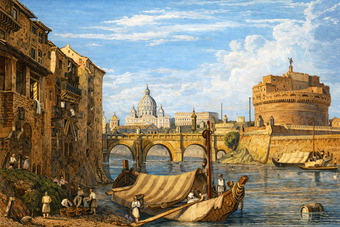 Die Abbildung zeigt einen Blick über die Tiberbrücke auf die Engelsburg (Castel Sant'Angelo), die Peterskirche und den Vatikan in einer historischen Ansicht. Das Bild stammt aus Band 1 von „Meyer's Universum oder Abbildung und Beschreibung des Sehenswerthesten und Merkwürdigsten der Natur und Kunst auf der ganzen Erde“, erschienen 1833. Das Digitalisat ist bei der Universitäts- und Landesbibliothek Düsseldorf unter https://nbn-resolving.org/urn:nbn:de:hbz:061:1-621229 abrufbar. Das Gesamtwerk wurde unter Public Domain Mark 1.0 Universell lizenziert, ist somit gemeinfrei und kann frei verwendet werden. Diese Bildvariante wurde mittels KI (Gemini) nachbearbeitet und coloriert.