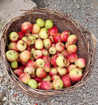 Das Bild zeigt einen geflochtenen Korb mit Äpfeln auf dem ApfelGut Erfurt. Es gelten die Nutzungsbedingungen der Mediothek und Pixiothek.