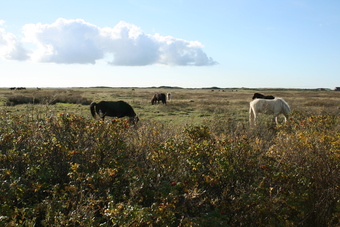 Abgebildet ist eine Marschlandschaft mit Pferden.