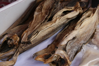 Abgebildet sind Stockfisch auf dem Fischmarkt in Bergen.