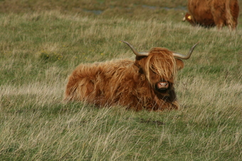 Abgebildet ist ein Shetlandrind auf einer Wiese.
