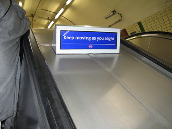 Das Foto gehört zur Serie London 2016. Es zeigt ein Hinweisschild auf der Rolltreppe zur U-Bahn (Underground, Subway, Tube). Es gelten die Nutzungsbedingungen der Mediothek und Pixiothek.