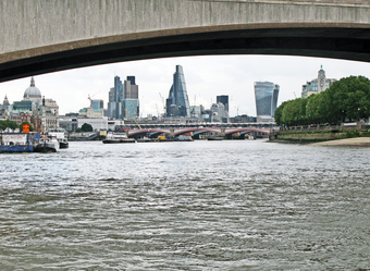Das Foto gehört zur Serie London 2016. Es zeigt den Blick bei der Bootsfahrt unter der Waterloo Bridge in Richtung Blackfriars Bridge. Im Hintergrund erkennt man beispielsweise links Saint Paul´s Cathedral und in der Mitte das Leadenhall Building, ein Hochhaus mit 225 m Höhe im Finanzbezirk der City of London. Es gelten die Nutzungsbedingungen der Mediothek und Pixiothek.