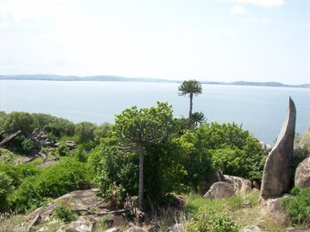 Das Foto zeigt ein Landschaftsmotiv in Tansania aus dem Jahr 2000, hier einen Blick auf den Victoriasee.