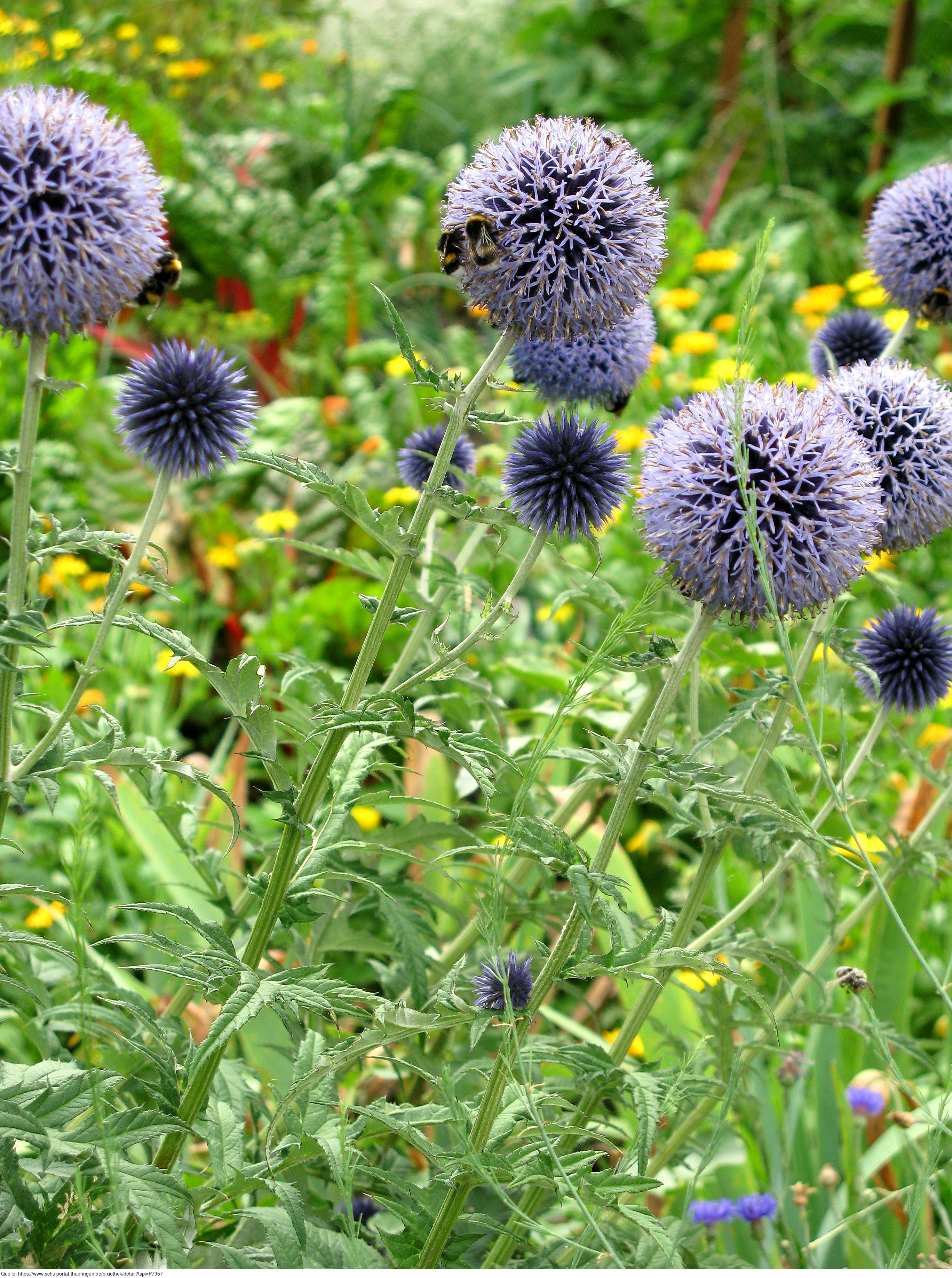 Das Foto gehört zur Serie Blumen im Garten. Es zeigt die Blüte einer Kugeldistel (Echinops ritro). Die Kugeldistel ist eine mehrjährige und anspruchslose Staude. Sie findet man in sonnigen Lagen und sie ist eine Bienenpflanze. Hier suchen Erdhummeln nach Nektar. Es gelten die Nutzungsbedingungen der Mediothek und Pixiothek.