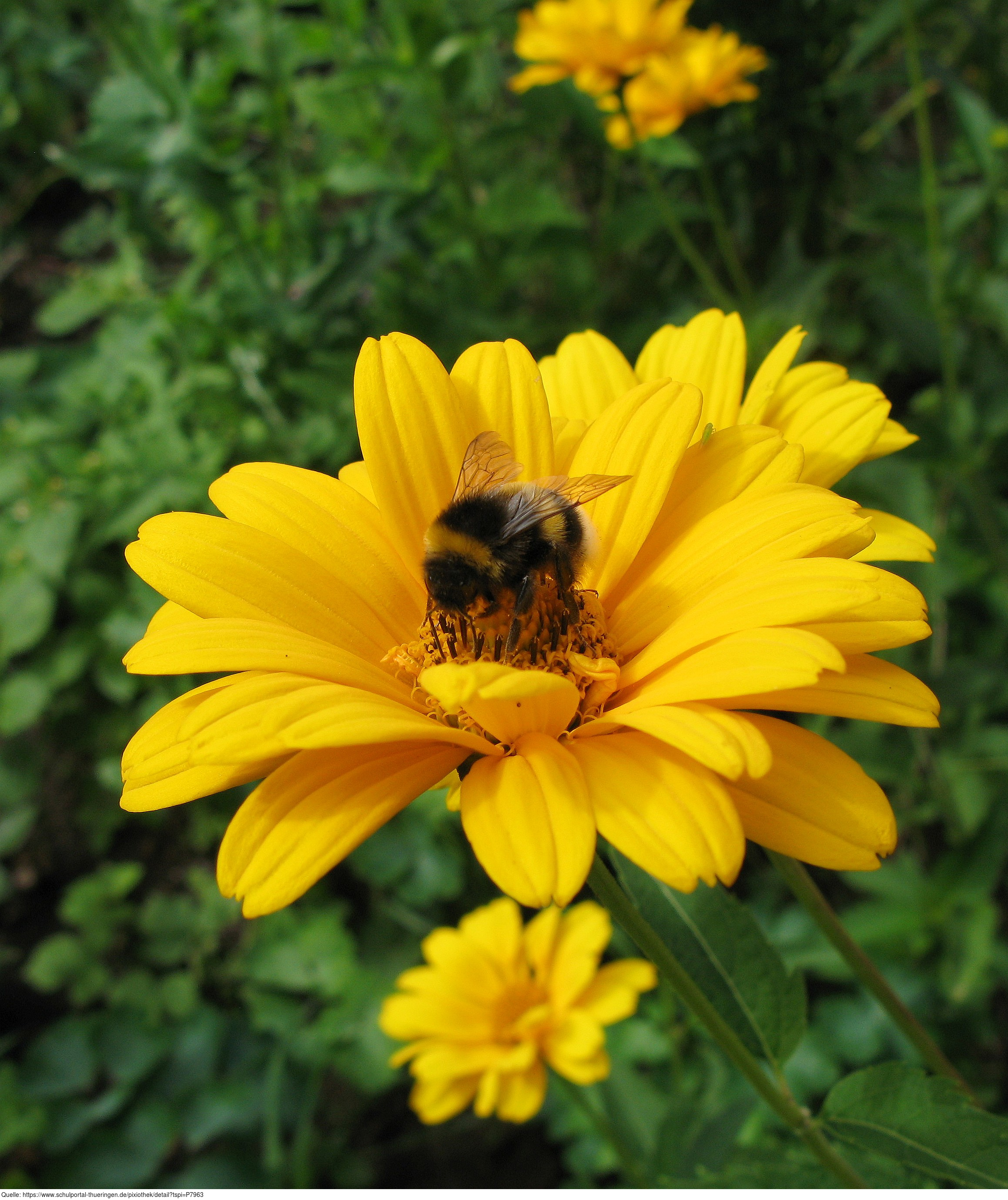 Das Foto gehört zur Serie Blumen im Garten. Es zeigt eine Ringelblume (Calendula). Sie ist einjährig und wächst am besten in Gruppen. Die Ringelblume ist nicht winterhart, wächst aber im Folgejahr durch ihren winterharten Samen von selbst wieder. Calendula officinalis war die Heilpflanze des Jahres 2009. Hier sucht eine Erdhummel nach Nektar. Es gelten die Nutzungsbedingungen der Mediothek und Pixiothek.