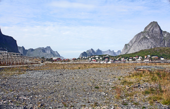 Das Foto gehört zur Serie "Lofoten". Es zeigt eine Wirtschaftsfläche mit Trockengestellen für Stockfisch. Es gelten die Nutzungsbedingungen der Mediothek und Pixiothek.