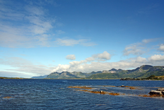 Das Foto gehört zur Serie "Lofoten". Es zeigt ein Panorama mit Meer und Bergen. Es gelten die Nutzungsbedingungen der Mediothek und Pixiothek.