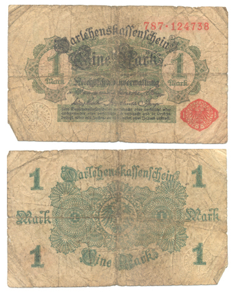Das Foto gehört zur Serie "Währungen im Deutschen Kaiserreich 1914 bis 1918". Es zeigt einen Darlehenskassenschein​ über "Eine Mark" vom 05. August 1914. Es gelten die Nutzungsbedingungen der Mediothek und Pixiothek.