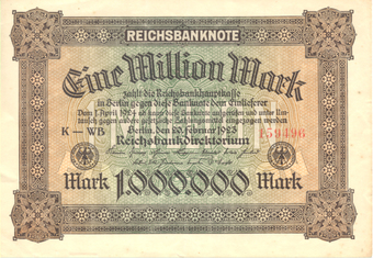 Das Foto gehört zur Serie "Zahlungsmittel in der Weimarer Republik (1918-1933)". Es zeigt eine Reichsbanknote über "Eine Million Mark" vom 20. Februar 1923. Es gelten die Nutzungsbedingungen der Mediothek und Pixiothek.