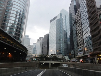 Das Foto gehört zur Serie "Hong Kong Trail". Es zeigt einen Teil der Skyline von Hong Kong, aufgenommen auf der Taxifahrt von Hong Kong