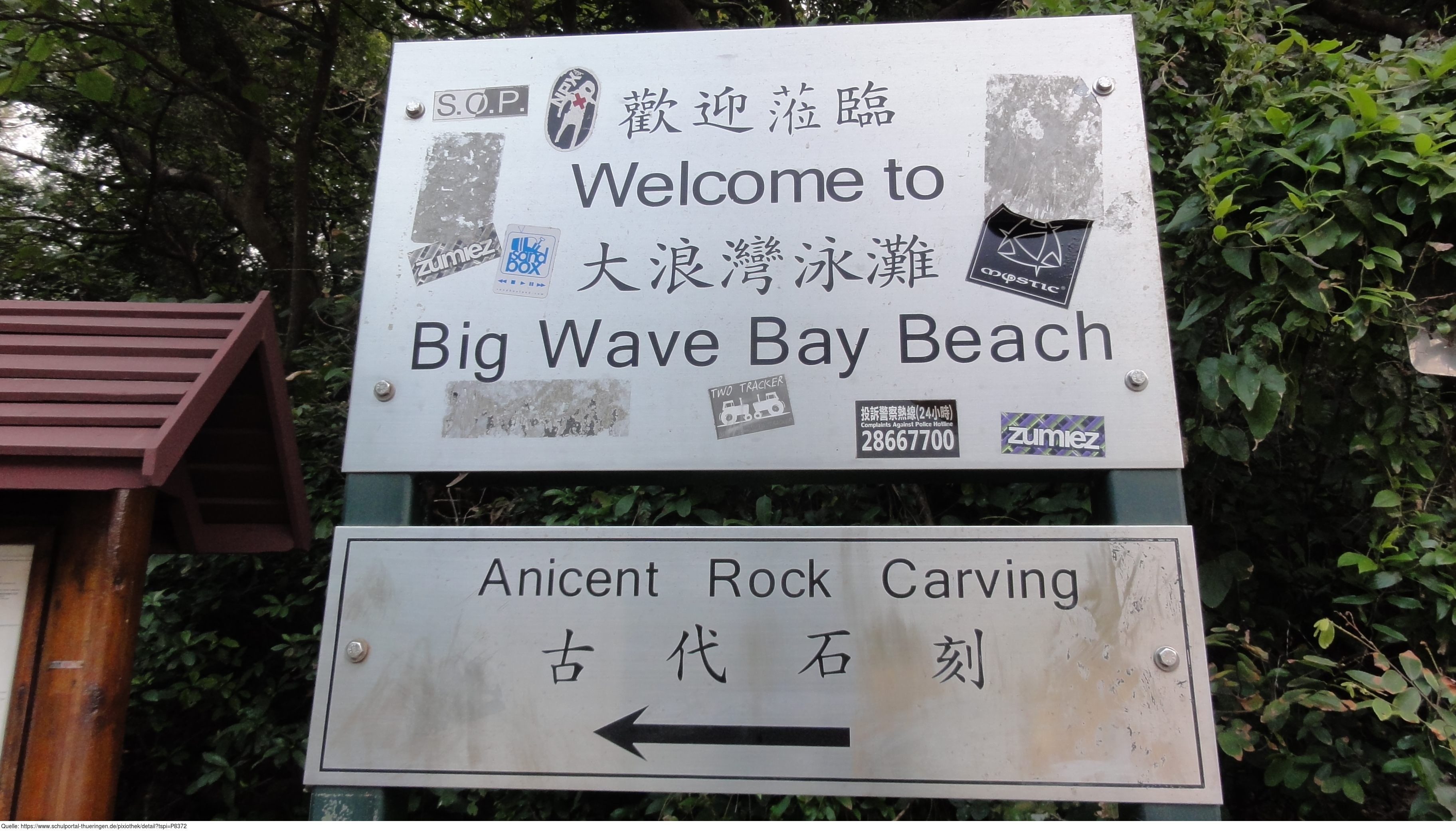 Das Foto gehört zur Serie "Hong Kong Trail". Es zeigt das Schild zum Big Wave Bay Beach in Tai Long Wan. Es gelten die Nutzungsbedingungen der Mediothek und Pixiothek.