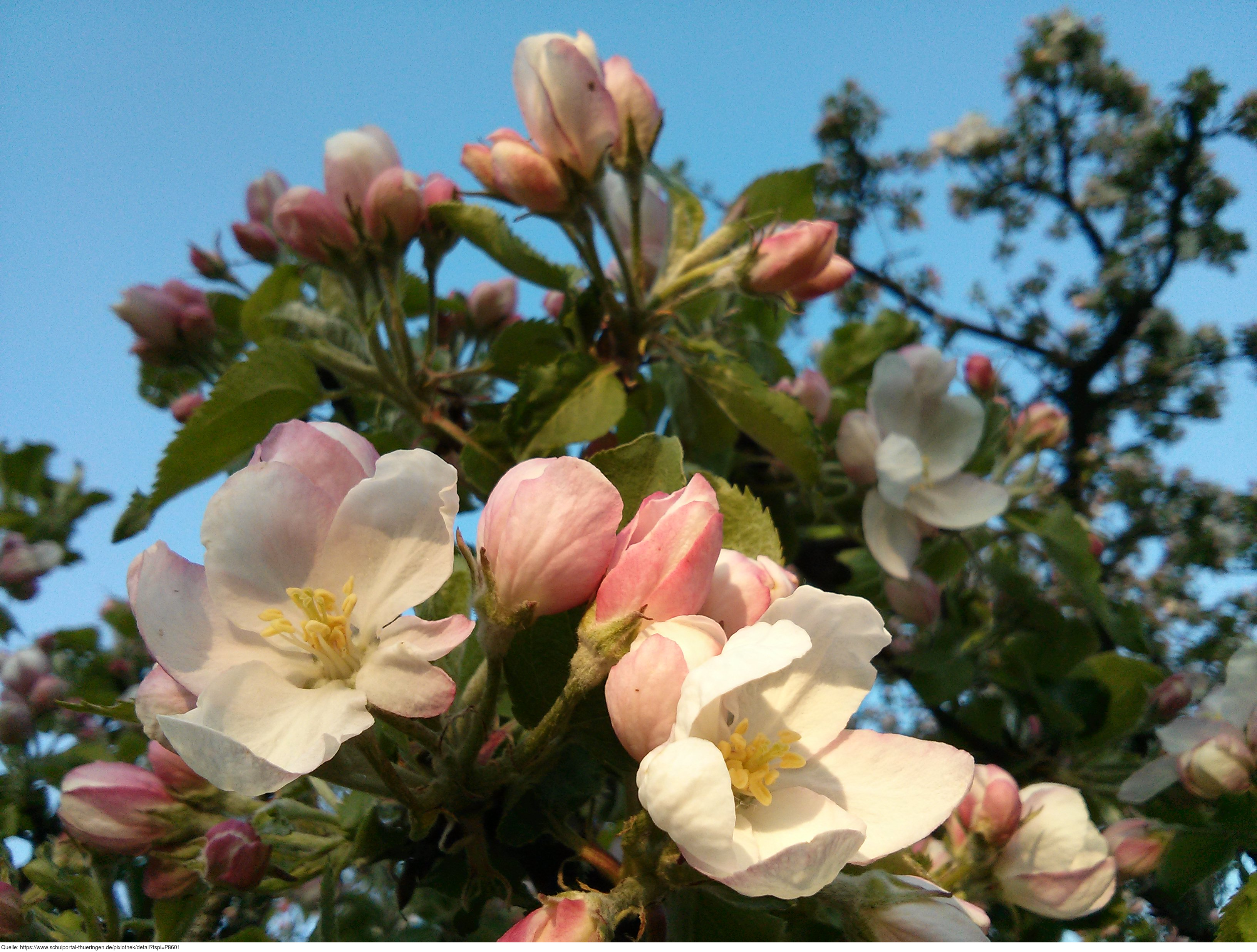 Das Foto gehört zur Serie "Obstbäume". Es zeigt Blüten an einem Apfelbaum. Das Bild ist unter CC0 lizenziert und kann somit frei verwendet werden.