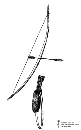 Das Bild gehört zur Serie "Zeichnungen Steinzeit - Museum für Ur- und Frühgeschichte Thüringens". Abgebildet sind Pfeil und Bogen sowie Fellköcher als typische Jagdwaffe der Jäger und Sammler. Es gelten die Nutzungsbedingungen der Mediothek und Pixiothek.