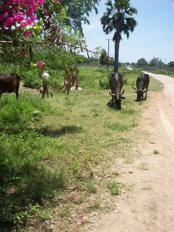 Das Bild wurde in Tansania aufgenommen. Es zeigt Rinder auf einem Wiesenstück am Straßenrand. Es gelten die Nutzungsbedingungen der Mediothek und Pixiothek.