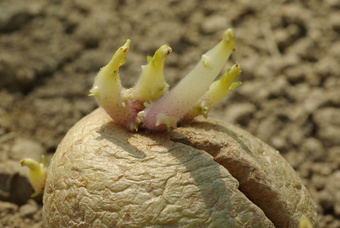 Das Foto gehört zur Serie "Nutzpflanzen". Es zeigt eine Saatkartoffel mit Dunkelkeimen auf dem Feld. Das Bild ist unter CC0 lizenziert und kann somit frei verwendet werden.
