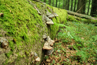 Das Foto gehört zur Serie "Laubbäume". Es zeigt einen liegenden abgestorbenen Baum (Totholz) mit Baumpilzen. Das Bild ist unter CC0 lizenziert und kann somit frei verwendet werden.