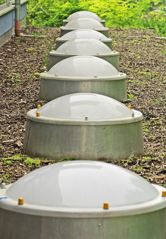 Das Foto gehört zur Serie "Beleuchtung". Es zeigt Lichtkuppeln, d. h. Oberlichter in einem Flachdach zur Belichtung des Innenraumes. Das Bild ist unter CC0 lizenziert und kann somit frei verwendet werden.