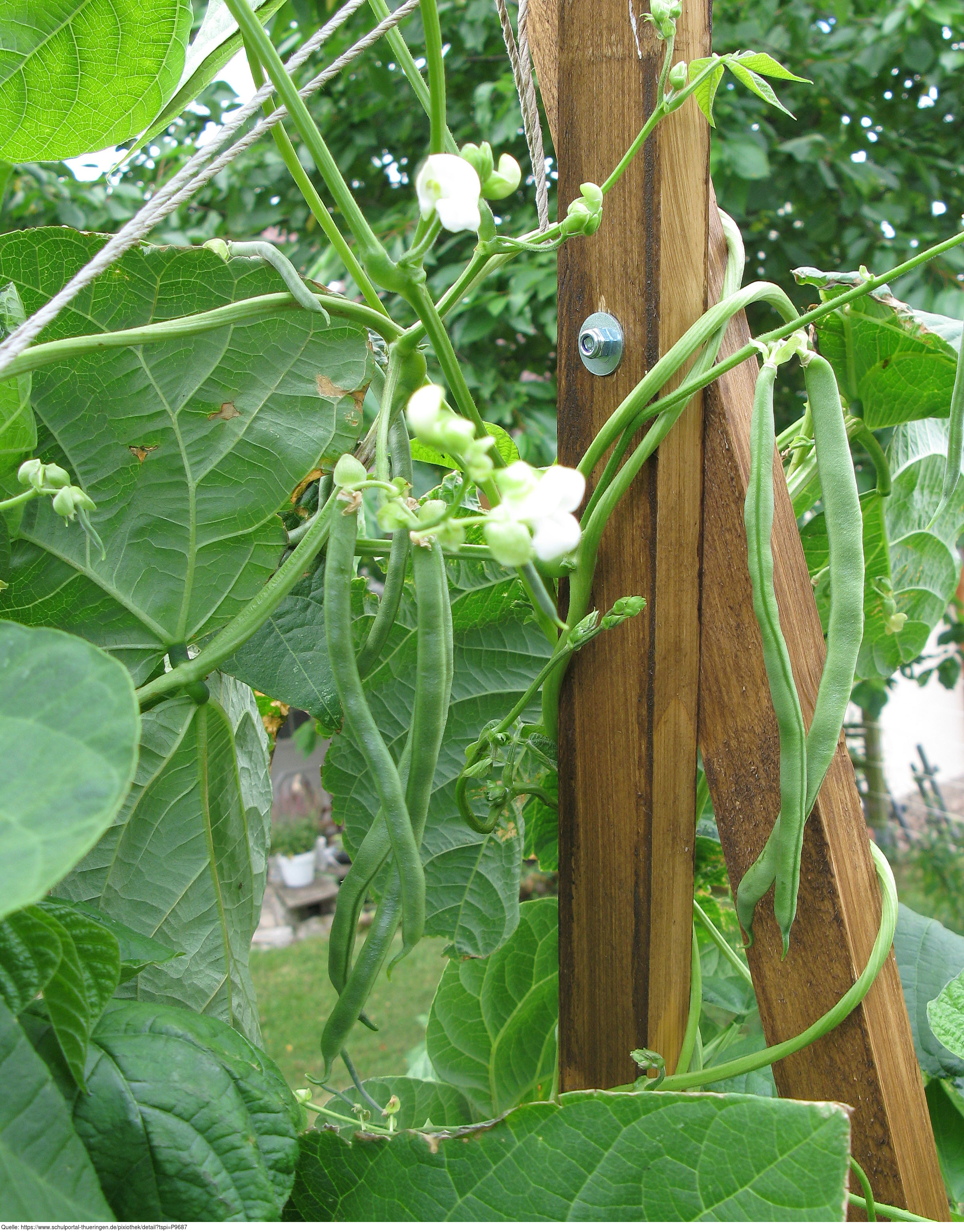 Das Foto gehört zur Serie "Gemüse". Es zeigt Pflanzen der Gartenbohne. Gartenbohnen, die unbegrenzt wachsen und sich dabei stark winden, bekommen vom Gärtner Stangen als Rankhilfen (Stangenbohnen). Das Bild ist unter CC0 lizenziert und kann somit frei verwendet werden.