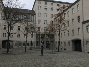 Innenhof des Bendlerblocks mit Gedenktafeln, Denkmal von Richard Scheibe 1953: Junger Mann mit gebundenen Händen. Es gelten die Nutzungsbedingungen der Mediothek und Pixiothek.